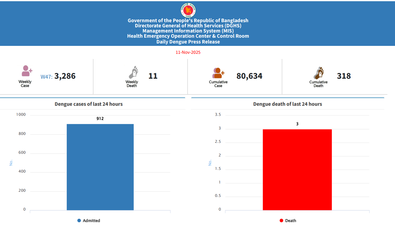 The Bangladesh Director General of Health Services (DGHS) reported an additional 912 dengue fever cases in the past 24 hours, bringing the cummulative total for 2025 to date to 80,634.