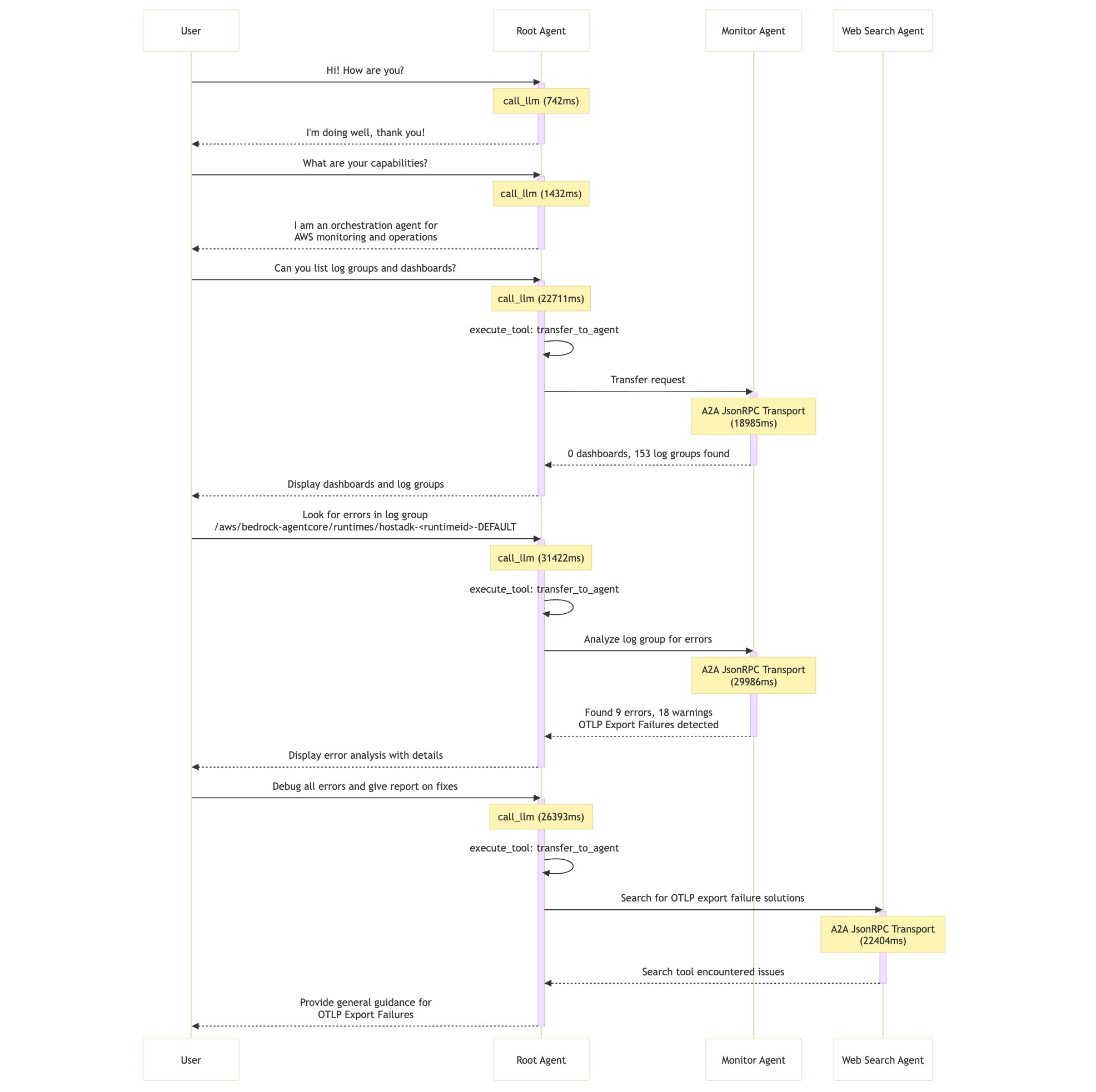 In this section, we will walk through an end-to-end workflow where the host agent manages conversations, gets the requirements from the user, and selects the best agent to route the request to (monitoring or operations agent). The monitoring and operations agent expose their agent cards that is used by the host agent for orchestration. In this example, we will test with simple error analysis from various log groups and search for remediation strategies.