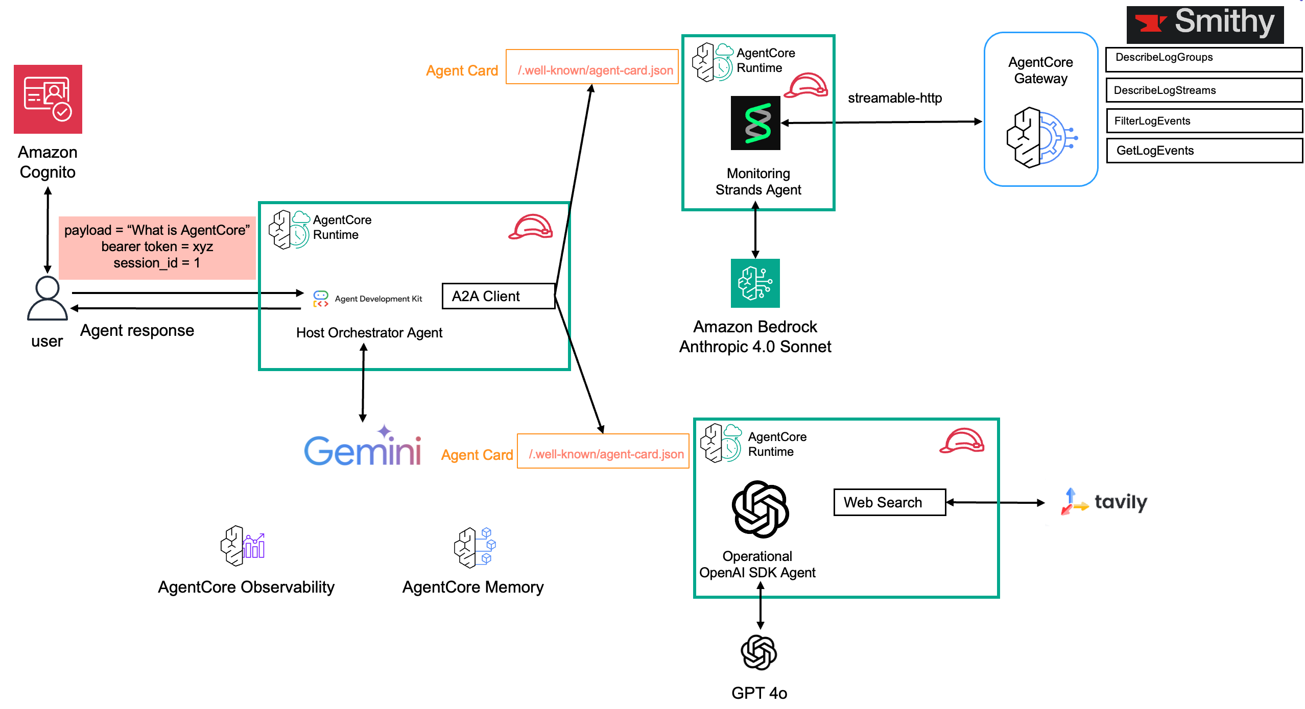 To demonstrate the power of multi-agent systems using A2A on Amazon Bedrock AgentCore Runtime, we’ll walk through an enterprise monitoring and incident response solution. This real-world use-case showcases how specialized agents built with different frameworks coordinate seamlessly to handle complex operational challenges through the A2A protocol.