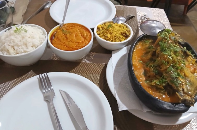 We wrap up with a moqueca (moh-keh-kah), a seafood stew (fish or prawns) that is a must in the Brazilian cuisine and that best reflects its African, native American and Portuguese heritages. There are regional variations, but this moqueca was made with fish in a base of tomatoes, peppers, onions, garlic, palm oil and coconut milk. Urucum (Bixa orellana) pigment was added for colour, and chopped coriander sprinkled on top. Served with rice, pirão (a thick cream made with cassava flour and fish stock) and farofa (toasted cassava flour, onions, spices and nuts from a local palm tree). A fabulous dish from Nega and Jéssica, owners of Duas Irmãs (two sisters) restaurant.