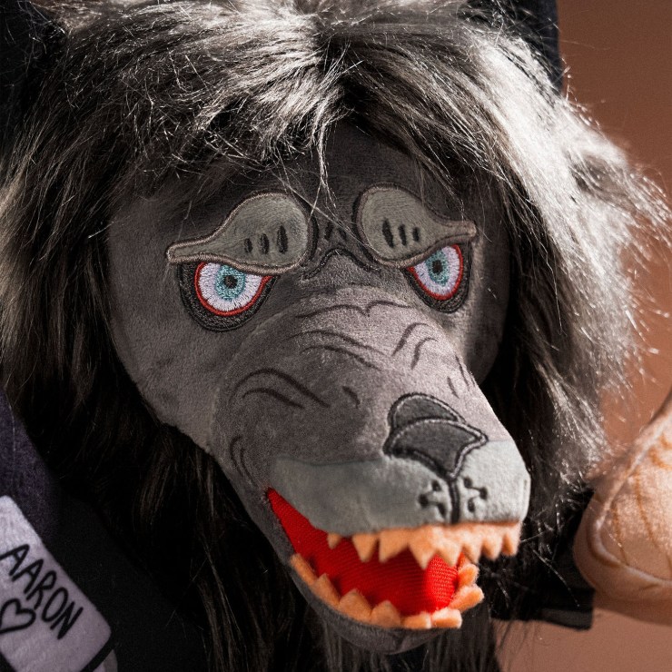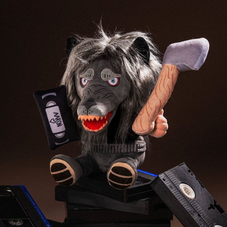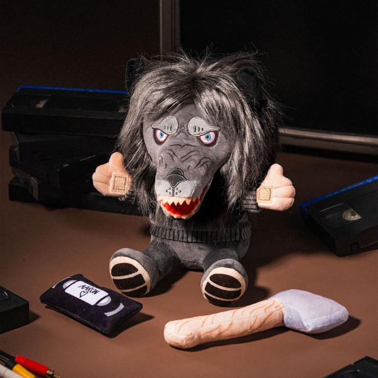 The 10.6″ stuffed animal comes with two important belongings — an axe and a VHS tape — that attach to its hands via Velcro.