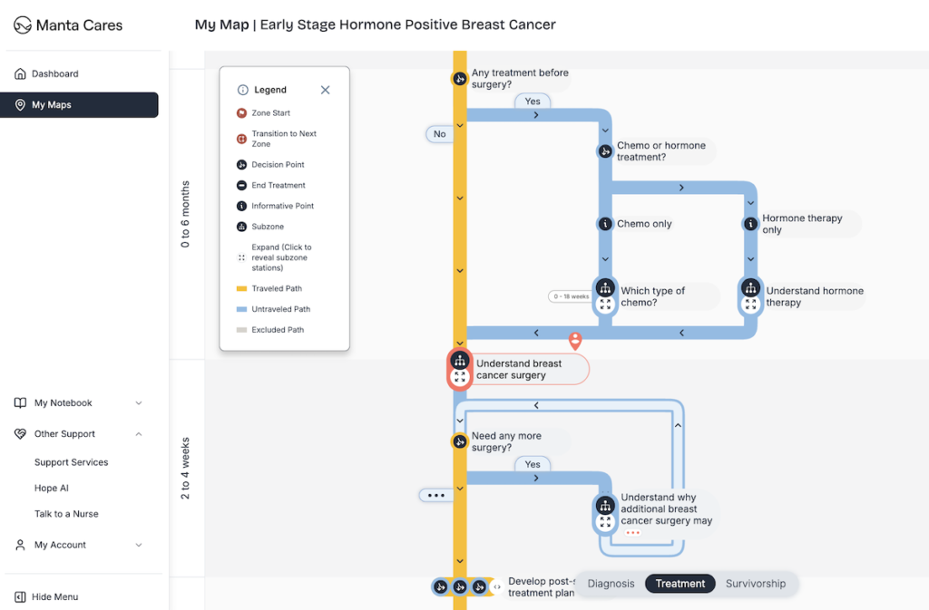 The platform centers on what Daswani calls “the map” – a visual representation resembling a subway system that charts 300-500 decisions patients face from first suspicion through treatment.