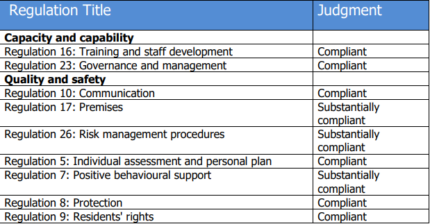 Sliabh Glas Community Group Home was found to be compliant and substantially compliant, while Ard Clochar Community Group Homes recorded no non-compliances.
