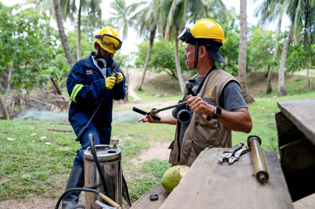 Members of a spray team prepare their equipment before spraying homes with insecticide to protect families from malaria in Kaukira, Honduras.