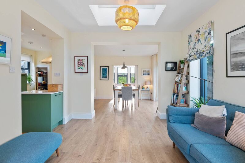 The front sitting room, with bay window, can be incorporated too thanks to sliding pocket doors that divide the spaces neatly.