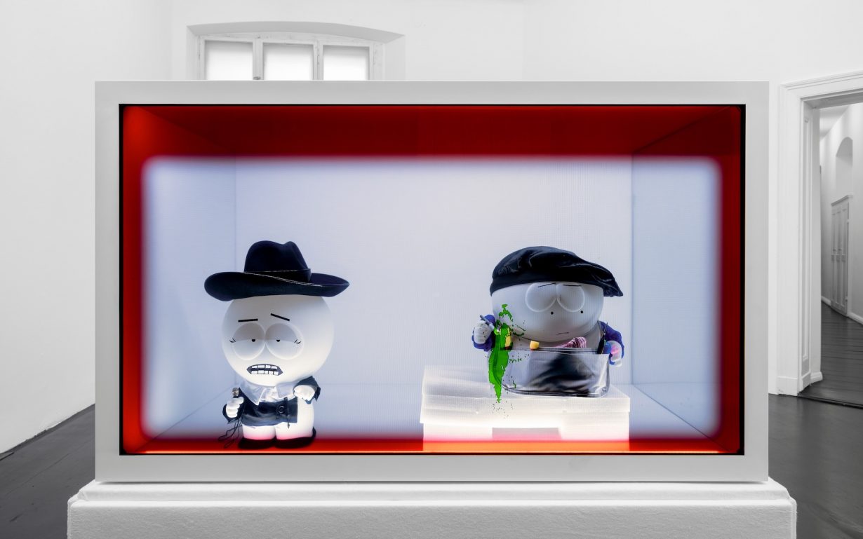 Which brings me to Now We Are On Easy Street, an exhibition by Marc Kokopeli which ran at Galerie Isabella Bortolozzi, Berlin, and ushered the American sitcom into the lexicon of fine art. The stripped-back carcasses of South Park’s forever youth of Eric Cartman, Kyle Broflovski, and Stan Marsh stood in four separate vitrines. Without their signature primary-coloured winter clothing, their forms manage to conveyed the bare bones of satire. Built into three-dimensional soft toys and clothed in outfits sewn and constructed by the artist, the characters’ changing expressions and a theatrical backdrop were shown on a transparent LCD screen which fronts a metre-long LED vitrine containing (imprisoning) the toys. The White House’s most recent crusade on the TV show derided ‘the left’s lack of authentic or original content causes them to gravitate toward low-brow television’. Kokopeli, for his part, believes its characters should be enshrined in two large-scale rectangular playsets.