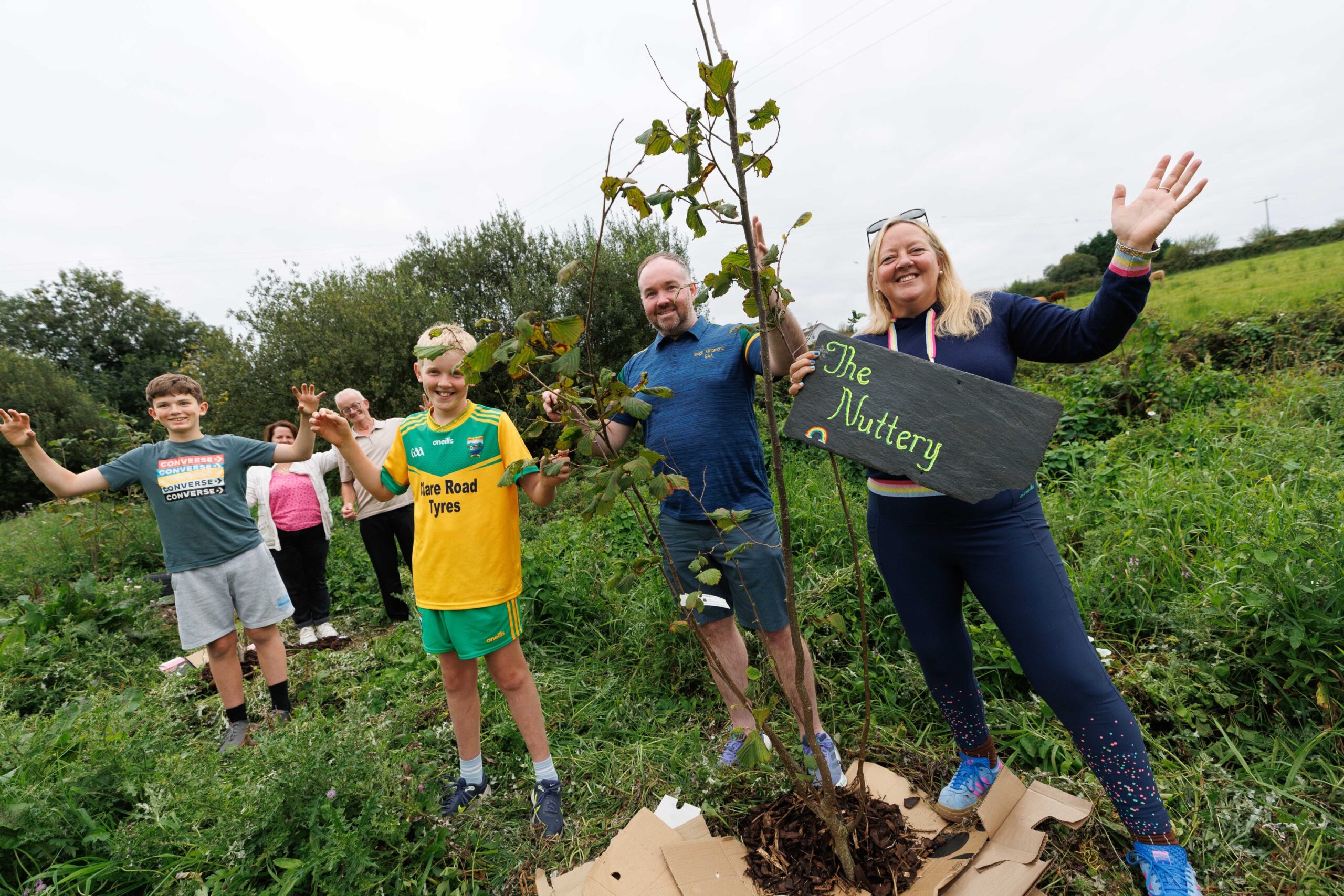 Jacob McEntee, Helen Meere, Thomas Mackey, Sean Gannon, Shane Lenihan, Green Club Officer and Roisin Garvey at the Inagh Nuttery where they have been planting native irish Hazel Trees and will make Nut Butter from the nuts. Photograph: Eamon Ward