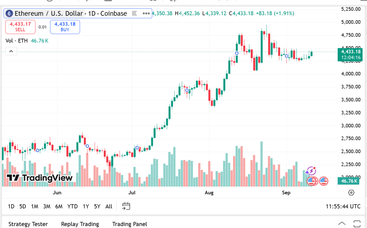 Ethereum is priced at $4,433.17, with a 2.3% daily gain, and its market capitalization at $534.74 billion. Its trading volume has increased by 37.05% to $41.4 billion, indicating robust participation from institutional and retail investors.Â