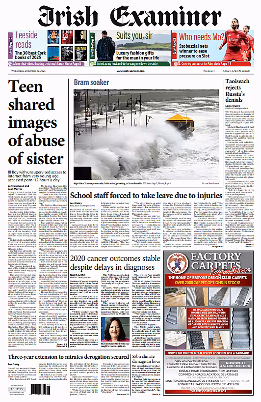 The Irish Examiner leads with a teenager who was sentenced for abusing his sister, as he shared images of the abuse.