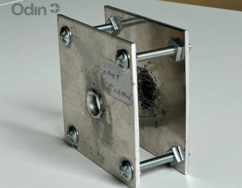 This 3.2-millimeter-thick aluminum plate was punctured by a single plastic projectile the size of a large salt crystal traveling 5 kilometers per second. Credit: Odin Space