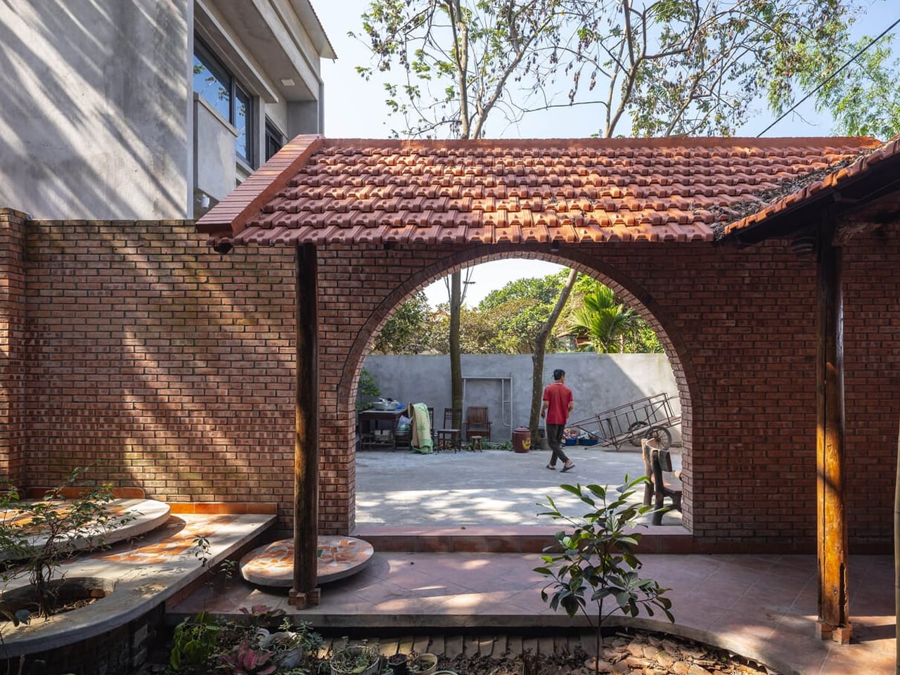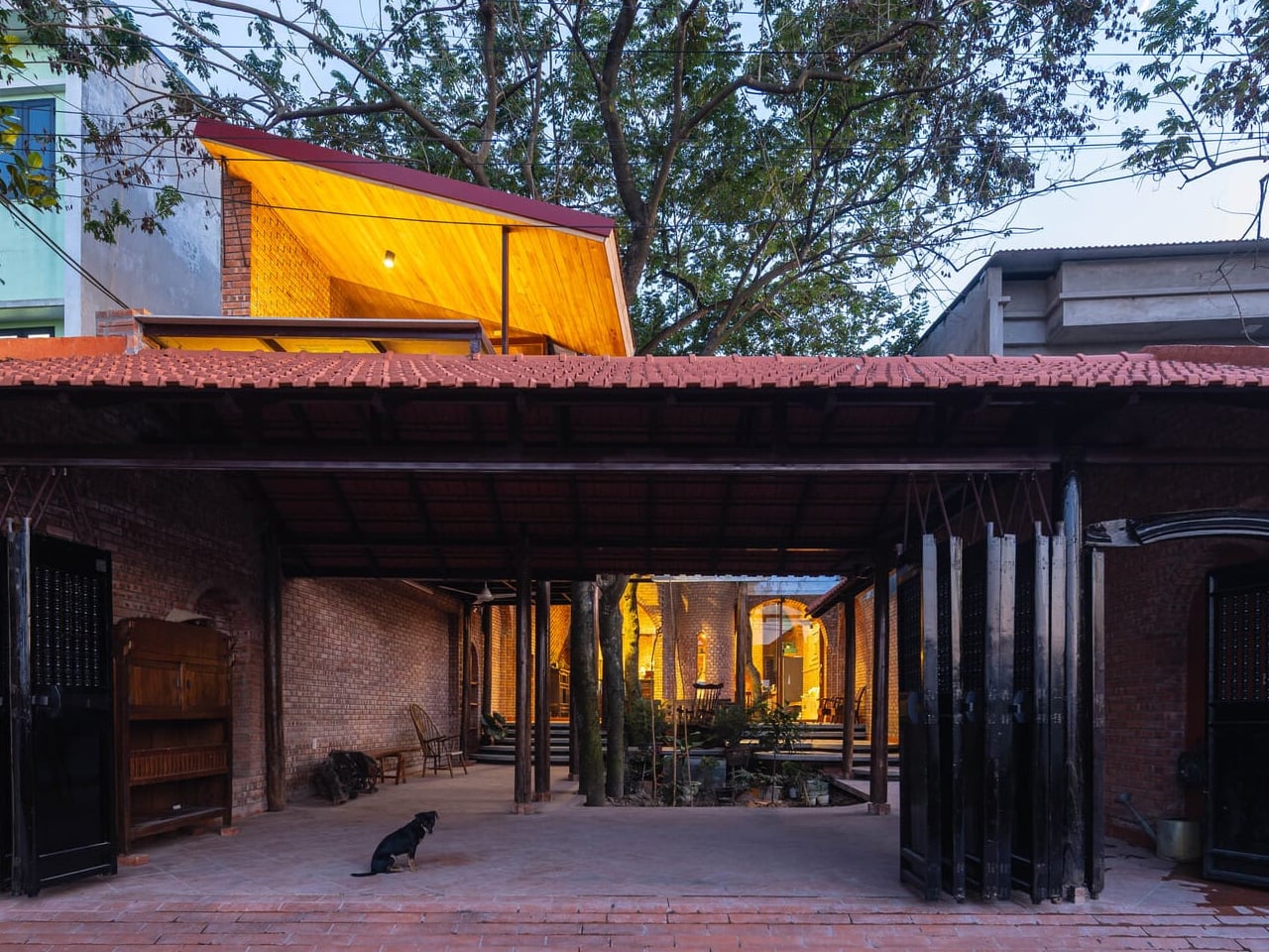What makes this project remarkable is its relationship with the site. Trees that have stood for years remain rooted in their original positions, their trunks accommodated by deliberate notches carved into rooflines. The canopy spreads over a central courtyard, blurring boundaries between interior and exterior spaces. This garden becomes the heart of the home, a breathing space where sunlight filters through leaves and generations gather. The design creates an airy, earthy dwelling where indoor and outdoor zones converge seamlessly, allowing natural ventilation to flow through the porous brick facade.