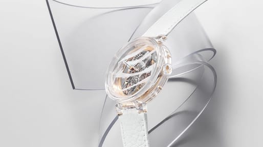 A collaboration between Frank Gehry and La Fabrique du Temps Louis Vuitton, the Tambour Moon collection was inspired by Gehry’s design for the Fondation Louis Vuitton in Paris and the Louis Vuitton Maison Seoul. Like their architectural forebearers, the watch is heavily transparent to five uninterrupted views of its inner workings.
