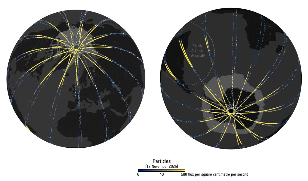 Swarm’s magnetometers also saw the storm. On 12th November, the mission measured magnetic fluctuations around ten times stronger than typical background levels. Over the 11–13 November period, ESA says proton flux at the poles briefly climbed to roughly 300 times normal levels.