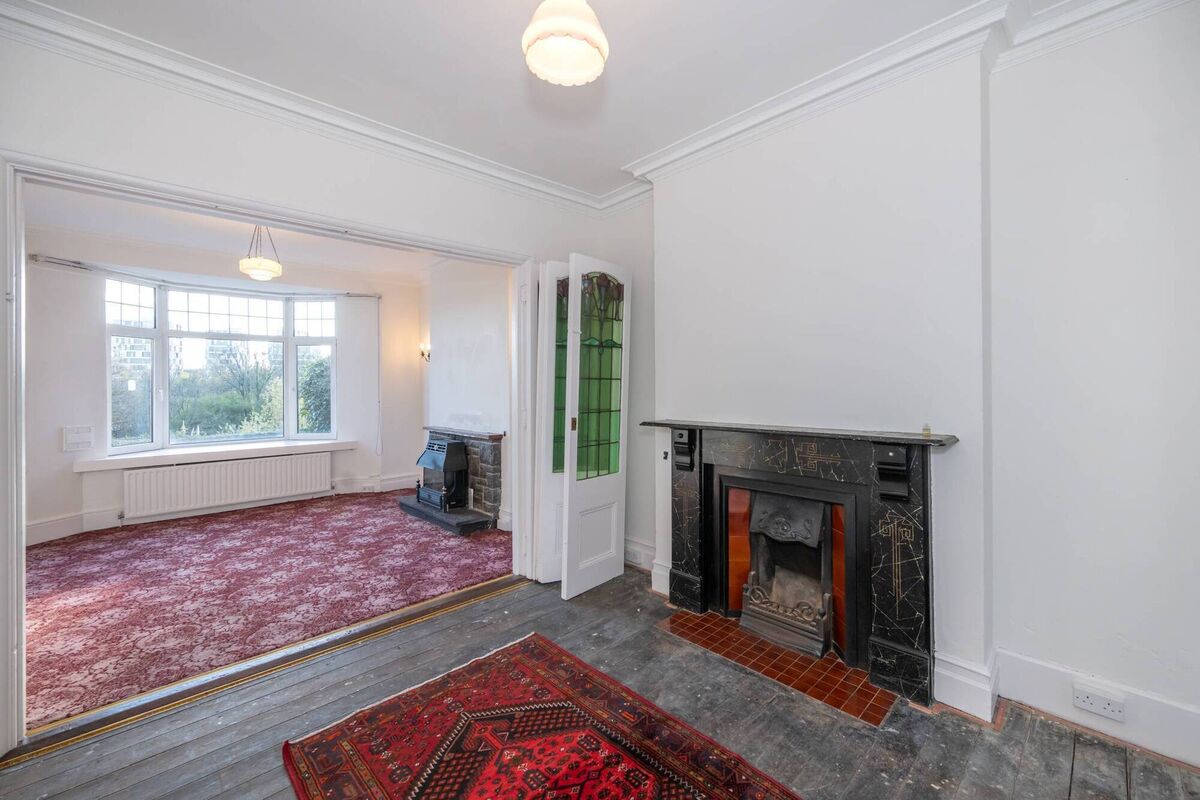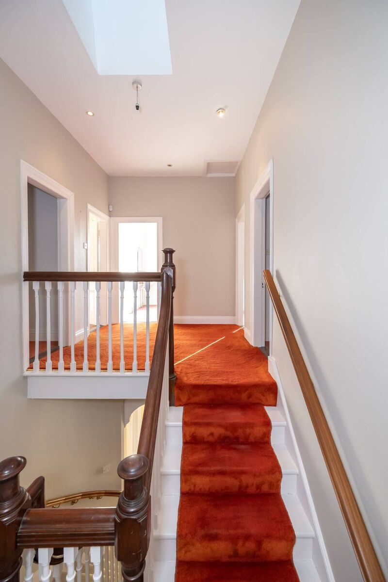 She says it’s full of internal architectural detailing, from fireplaces to doors, architraves high ceilings, plasterwork, panelling, stained glass partition doors, floors and tiling, and with a lovely slight kink at the ground level’s start to the feature staircase with impressively solid mahogany rails, newels and posts.