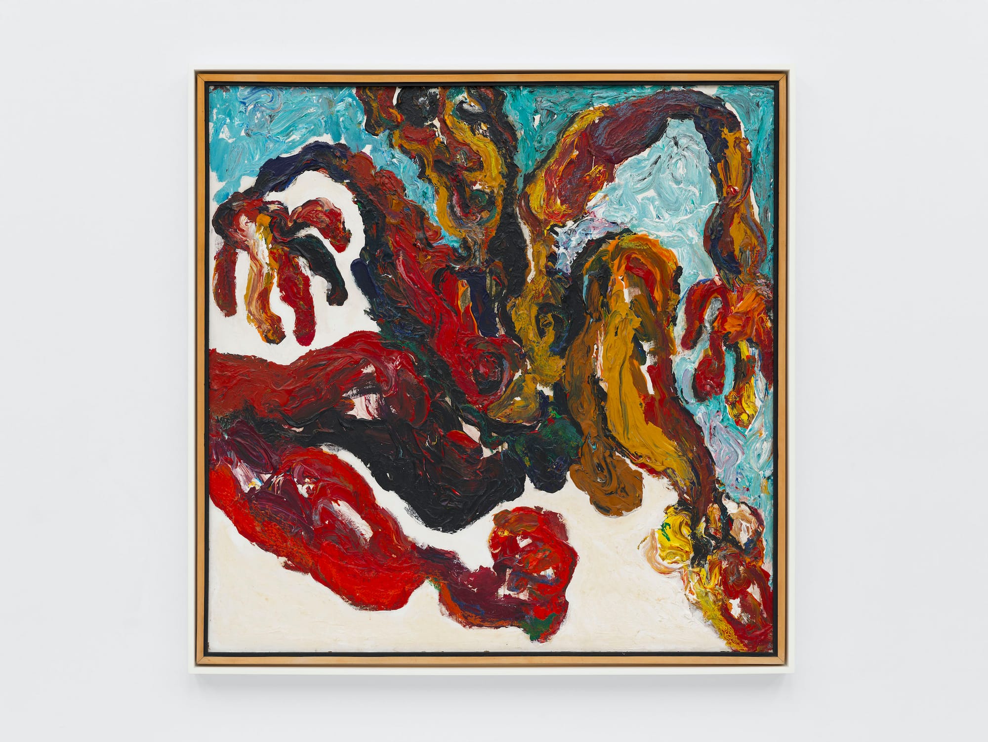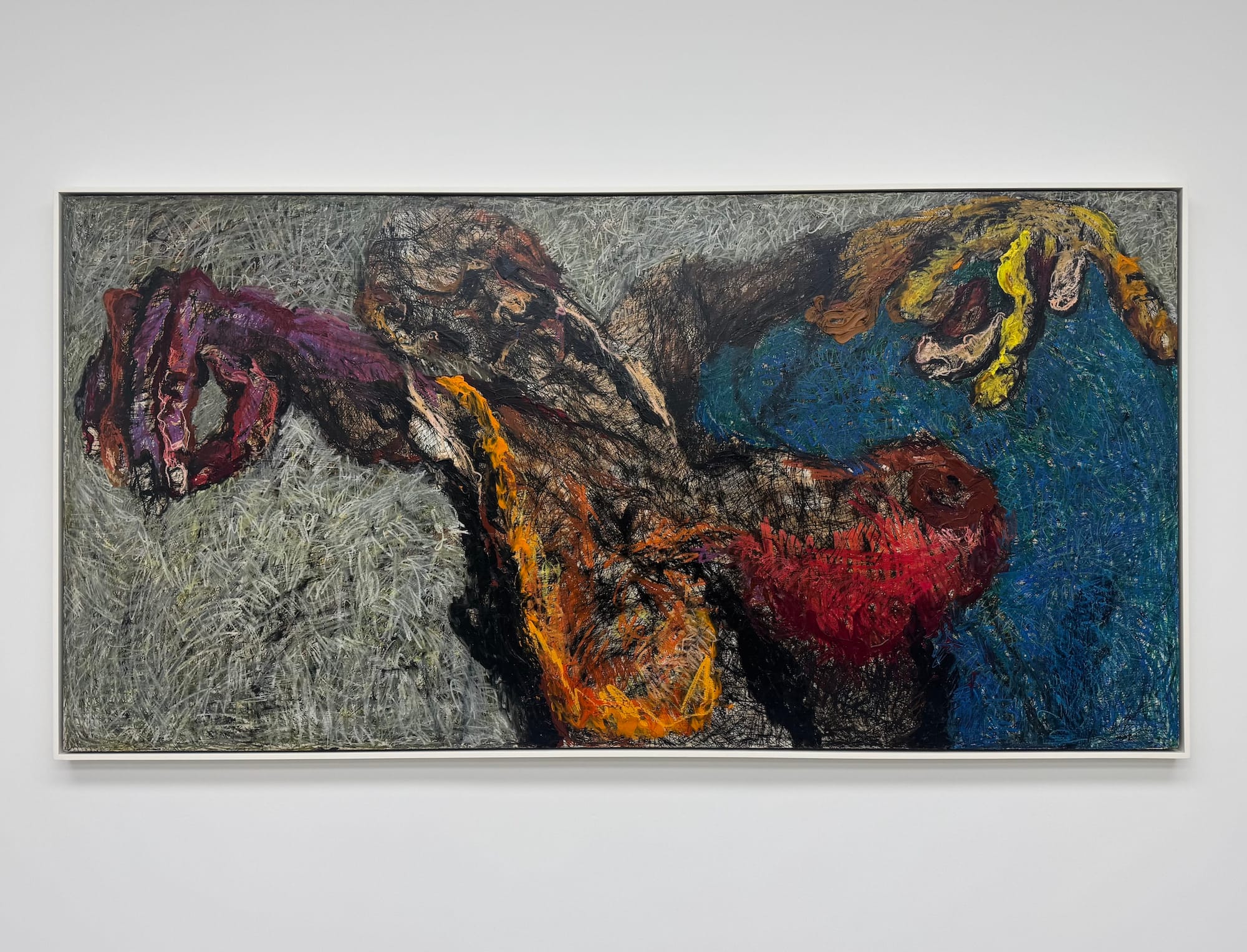 At age 83, she still paints every day. Her approach to texture, which she dichotomizes as both visual and tactile, has been developing since age four. She uses acrylic paint and oil pastels on masonite, an innovation born out of a residency in Australia, where she wasn’t able to procure enough oil paint and knew her canvases would not dry in time to be shipped home. (Also, her children “could not stand the smell of turpentine,” she told me.) The resulting artworks are thrilling impastos, sculptural in quality. She has fittingly identified these detonations of color, which physically undulate from their surfaces, as “structural abstract expressionism.”