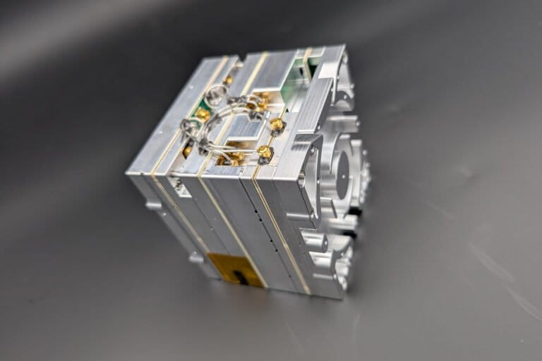 Image of the ICARUS receiver payload that is integrated within the GENA-OT satellite. The ICARUS receiver measures 10 x 10 x 10 cm and weighs approximately 1 kg. Credit: TALOS GmbH.