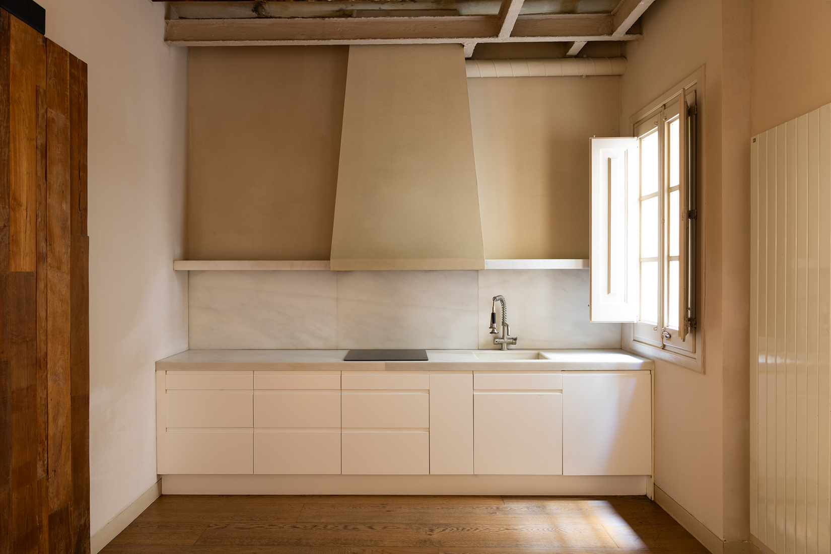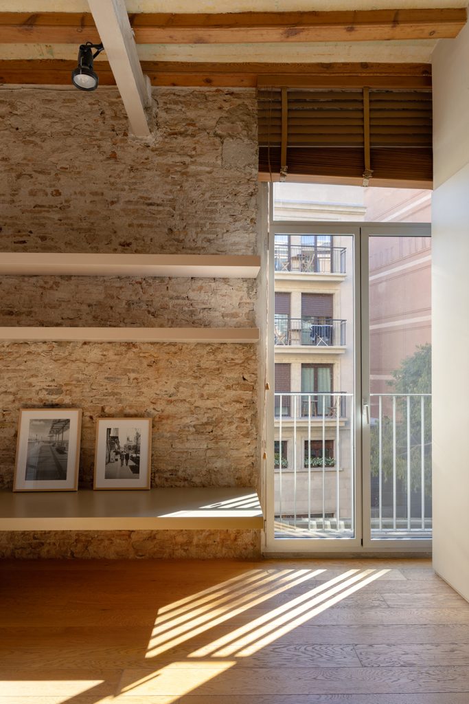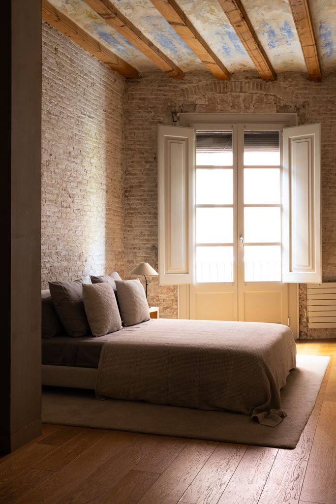Across four distinct homes, the renovation balances preservation with restraint. Parquet flooring runs throughout, setting a calm base for updated kitchens and marble-finished bathrooms, while industrial-style ducted air conditioning and natural-gas radiators are integrated without visual noise. Custom joinery improves circulation and storage, keeping the original structure intact. Balconies and terraces introduce moments of outdoor space — some addressing the street, others opening to an internal courtyard defined by arches and high openings typical of Ciutat Vella’s historic streetscape.