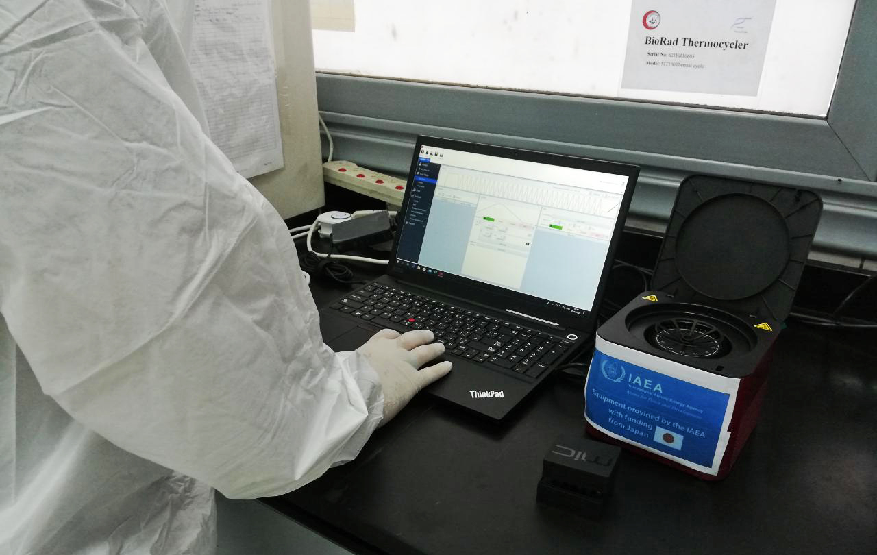 The machine for processing DNA being used in COVID-19 diagnostics.The machine for processing DNA, right, being used in COVID-19 diagnostics. Image by IAEA Imagebank via Flickr (CC BY 2.0).
