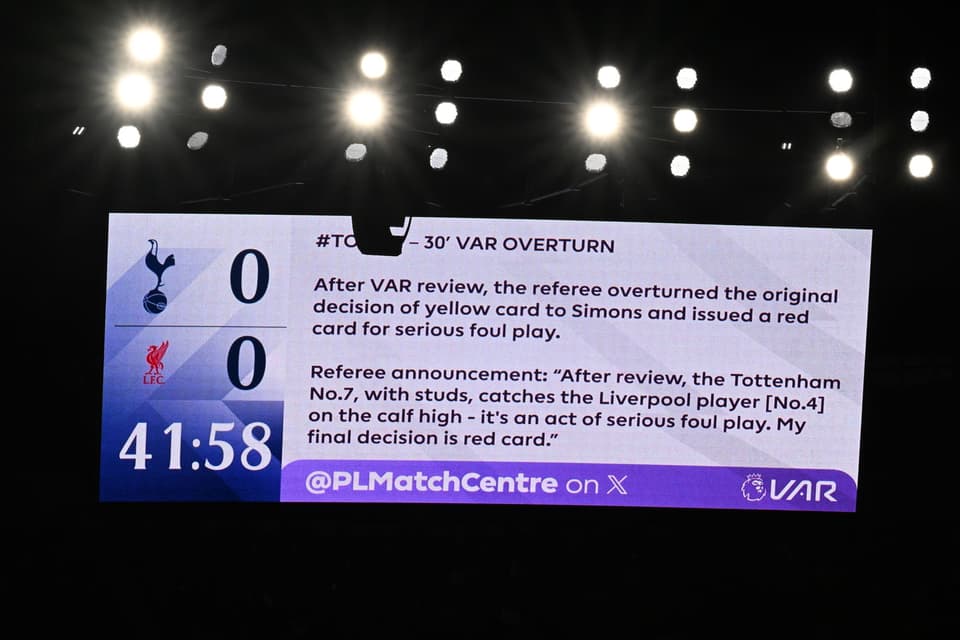 A statement reads: “After VAR review, the referee overturned the original decision of yellow card to Simons and issued a red card for serious foul play.