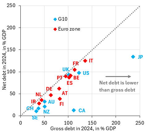 The standard policy prescription for countries with too much debt is to cut spending and raise taxes. Japan has a third option, which is for the government to sell some of the financial assets it holds and use the proceeds to retire debt. These asset holdings are very substantial, which is why Japan’s net government debt is so much lower than its gross debt.