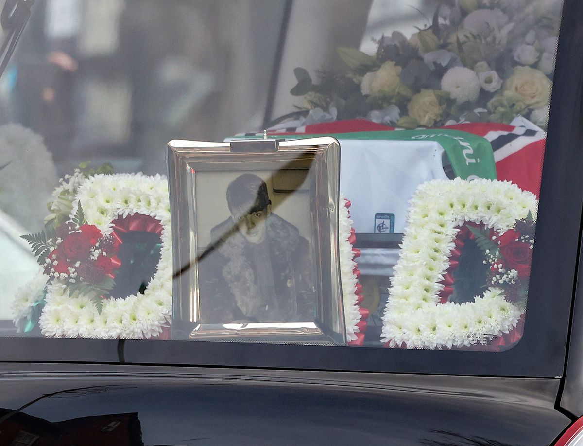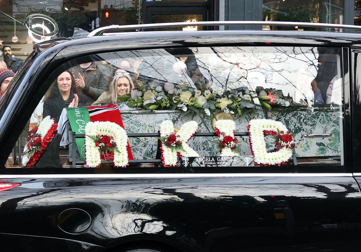 Two football scarves – red, black and white for Manchester United and vivid green for his Celtic Supporters Club – adorned the coffin. Beside these were simple red-and-white floral arrangements bearing the words R’KID and DAD.
