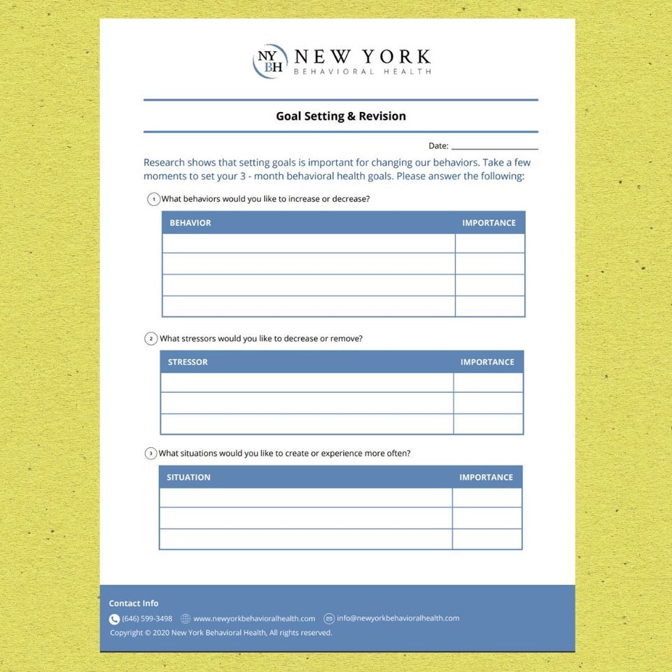 A free goal setting and revision downloadFreely available on the New York Behavioral Health website are these downloadable sheets that can help establish new goals and revise the old ones that are no longer serving you.