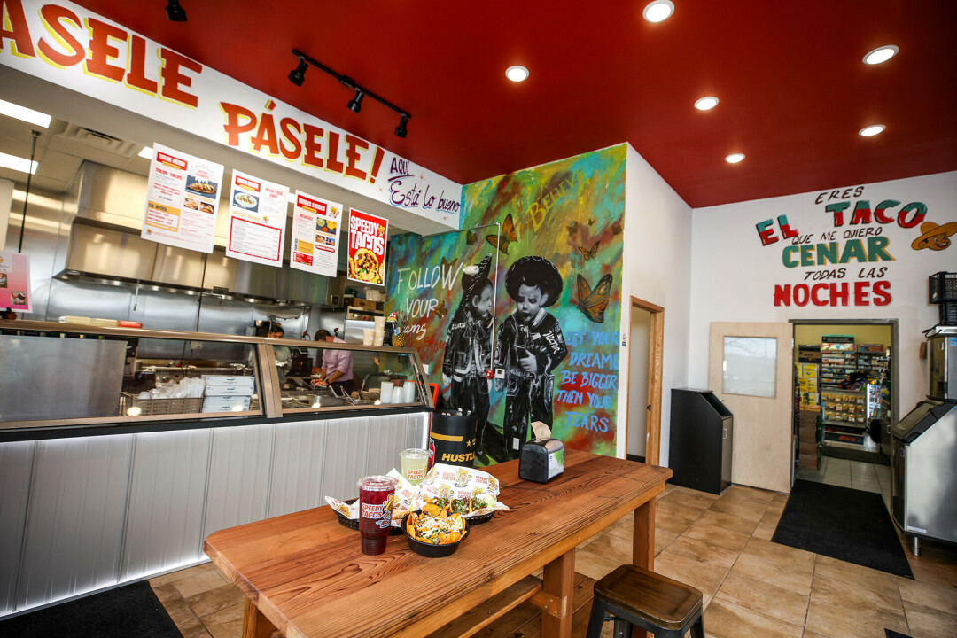 On the “Speedy Tacos” side folks can order grub to go or take a seat inside, while the right side of the building houses convenience store goods.