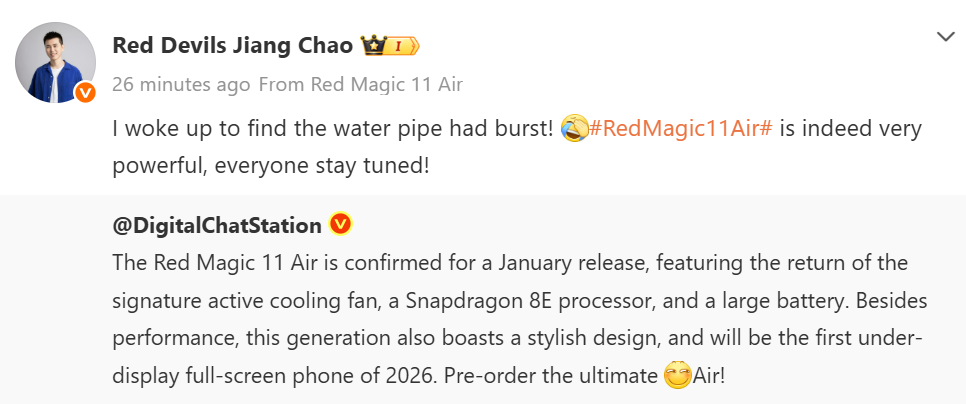 As seen above, popular tipster Digital Chat Station has claimed that the Red Magic 11 Air will be unveiled in January 2026 in China. The said Weibo post has been reshared by Chao, who stated that the device is indeed very powerful.