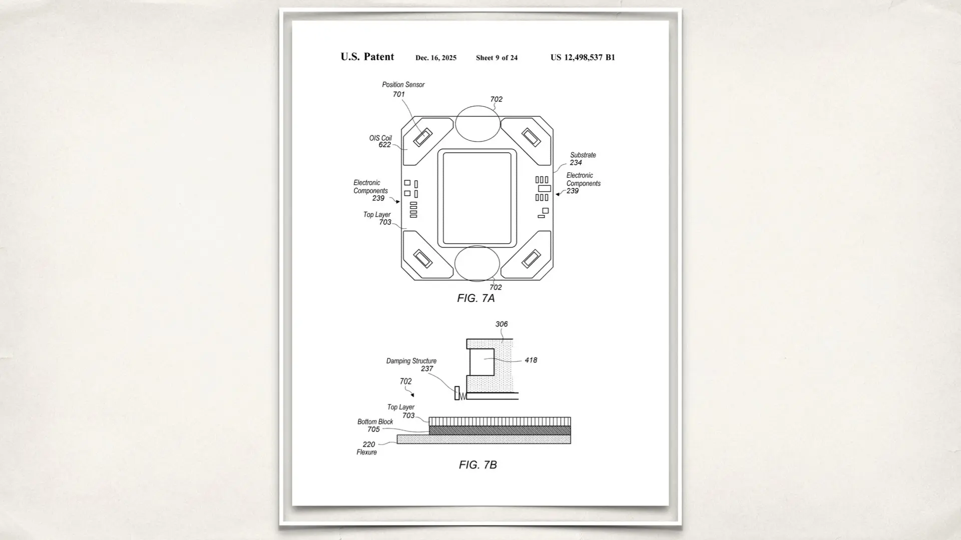 US 12,498,537 B1 focuses on how the camera module is physically constructed. The key idea is separation. Apple is clearly dividing autofocus and stabilization into two distinct mechanical systems that are designed not to interfere with each other. Autofocus is handled by a lens carrier that moves along the optical axis. Sensor shift stabilization is handled by a separate platform that moves the image sensor itself. These systems are no longer sharing motion paths or structural compromises. This is not about adding more movement but controlling movement more precisely.