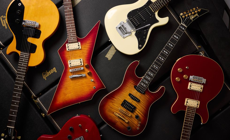 A selection of Gibson Certified Vintage offerings, including a 1984 Explorer XPL prototype in Cherry Sunburst