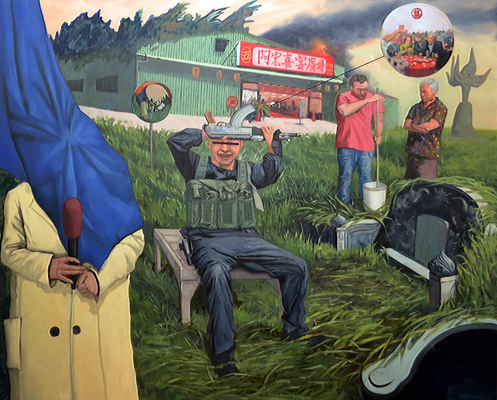 In an effort to expand the reach of its international and contemporary art collection, the Pérez Art Museum Miami acquired a painting from emerging Taiwanese artist Guan-Hong Lu. In “Apocalypse Now: From Cradle to Grave” (2024), Lu stages a searing, absurdist composition juxtaposing a faceless journalist reporting from outside of a burning banquet hall as a party continues, an armed individual whose identity is redacted, and two men at work despite the chaos unfolding.
