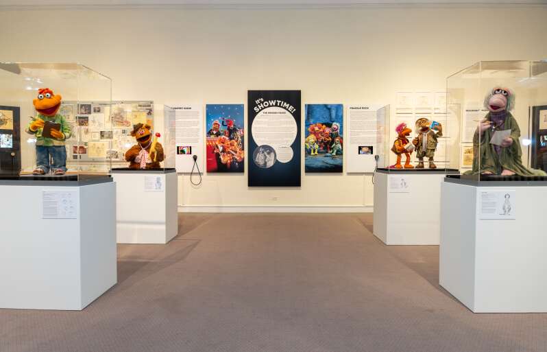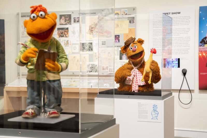 Fozzie Bear puppet, to the rear, at the From Pencil to Puppet exhibition, celebrating the work of Michael Frith, at the Bermuda National Gallery (Photograph courtesy of the Bermuda National Gallery)