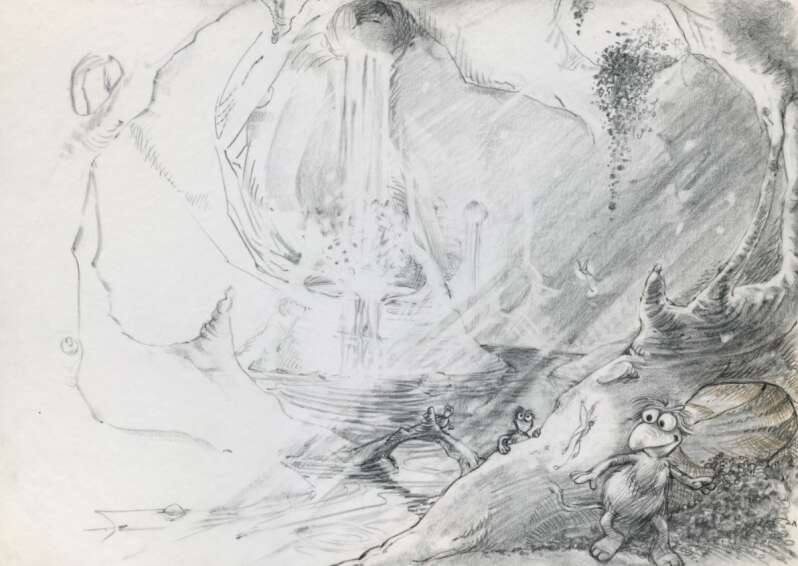 Notably, among the drawings are Frith’s earliest sketches for Fraggle Rock, which aired between 1983 and 1987. He completed the drawings during the first planning meeting on stationery from the Hyde Park Hotel in London, where Henson had gathered a group to brainstorm a new series. Frith’s initial sketches of Mokey, Red, and Gobo, exhibited in the gallery, ended up remarkably similar to their final forms after the puppet makers brought them to life. Moreover, the gallery displays an early drawing of the Fraggles’ cave dwelling. Anyone who’s ever seen the show knows how central the Fraggle subterranean world is to its concept. As he worked, Frith realised his vision was based on Bermuda, specifically the Crystal Caves. He thought back to the story of the caves’ discovery, the two boys chasing a cricket ball, and was inspired by the notion of encountering a hidden world below the surface.