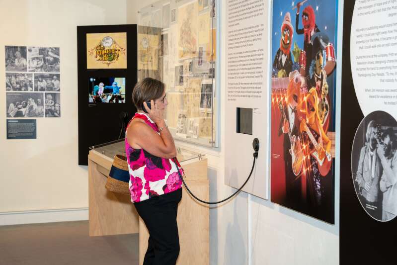 A visitor interacts with the From Pencil to Puppet exhibition, celebrating the work of Michael Frith, at the Bermuda National Gallery (Photograph courtesy of the Bermuda National Gallery)