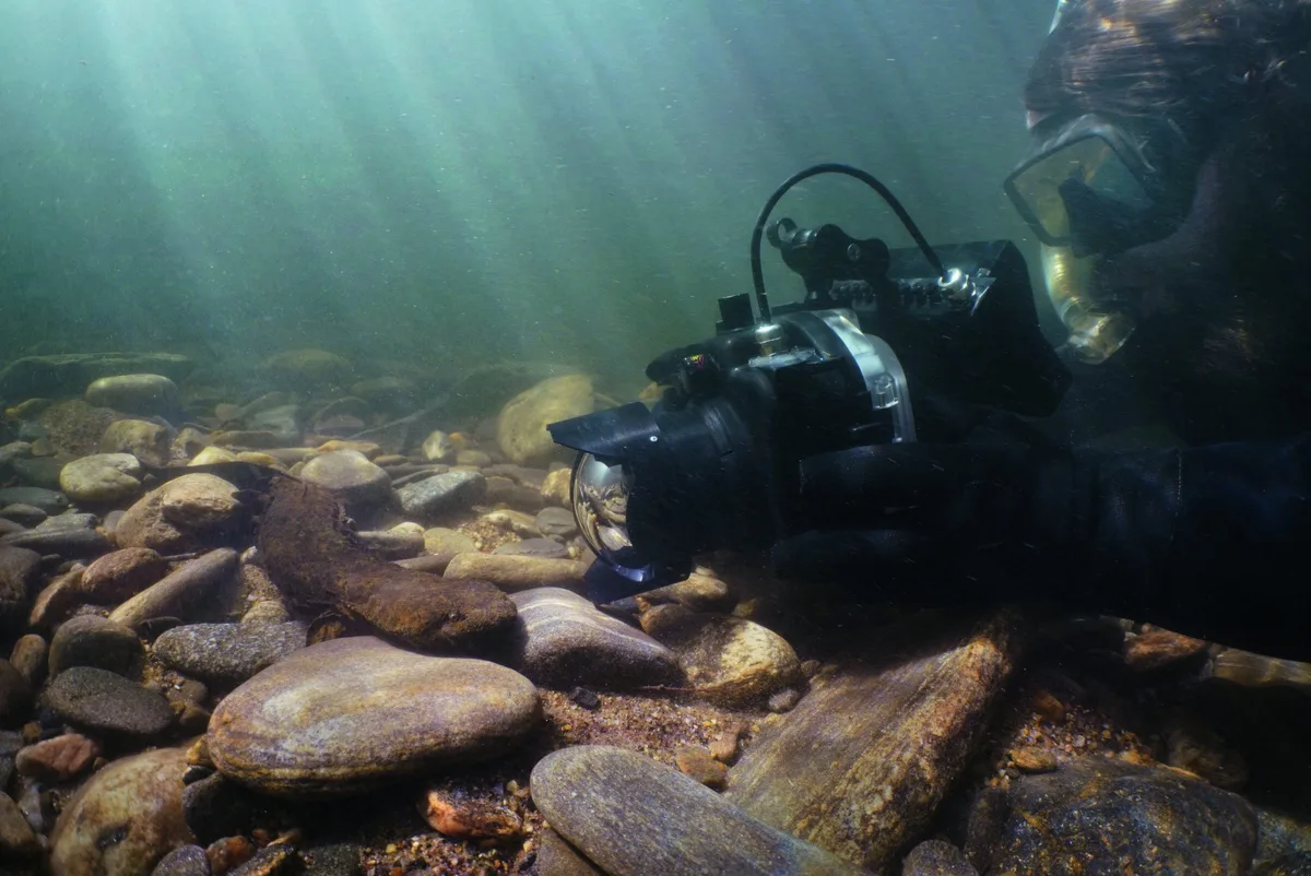 I spent a month filming hellbenders with a couple of friends in the mountains of North Carolina. Hellbenders are giant (60cm) aquatic salamanders with beady eyes, wide mouths and wrinkled skin, through which they absorb oxygen from the water. Observing the same individuals as they progressed through the breeding season made me feel a strong connection to them.
