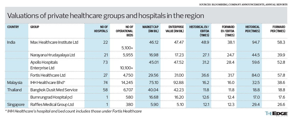 Recent transactions suggest that valuations for the healthcare sector are going north. For instance, IHH acquired Island Hospital Sdn Bhd for RM3.9 billion cash. The deal, which comes with land for expansion, valued the 500-bed hospital at a historical EV/Ebitda of 24.6 times.