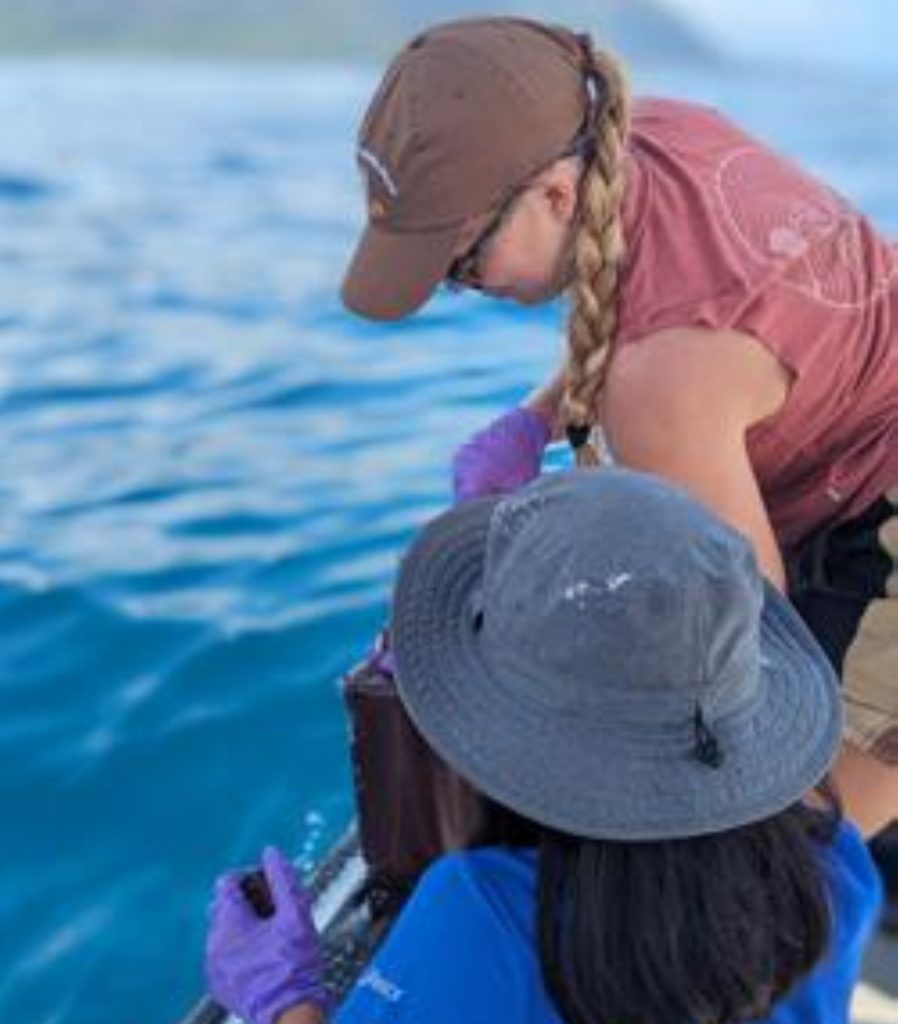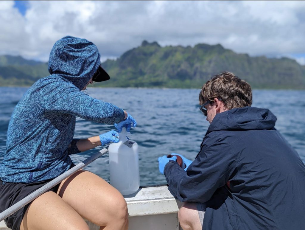 Researchers sample surface seawater as a part of the Kāneʻohe Time Series, established in 2017 by the Rappé Laboratory for Aquatic Microbial Ecology. (Photo Credit: Kelle Freel)