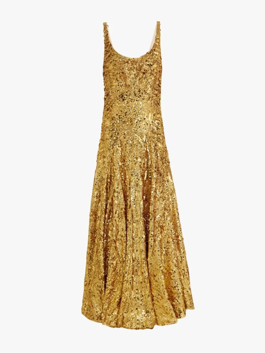 According to Taylor Swift style expert Sarah Chapelle, Swift opted for Rabanne’s sequined crepe de chine maxi dress, which is currently available for $3,650 on Net-A-Porter. She topped off the dress, which features thick straps and a scooped neckline, with a beige shawl. You can see the images here.