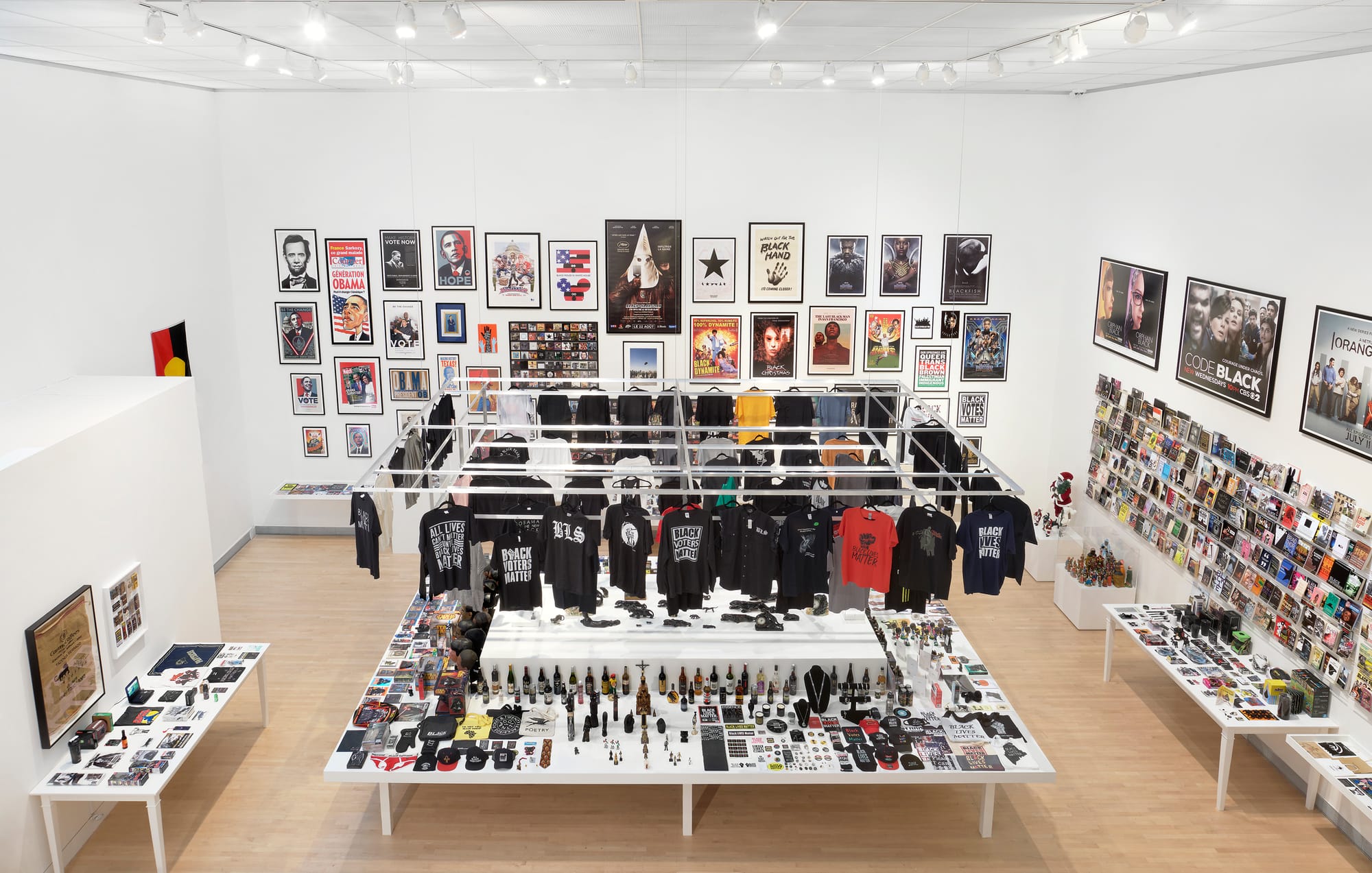 Installation view of Fred Wilson’s Black Now! (2025) in Reflections at the Rose Art Museum (courtesy Rose Art Museum)