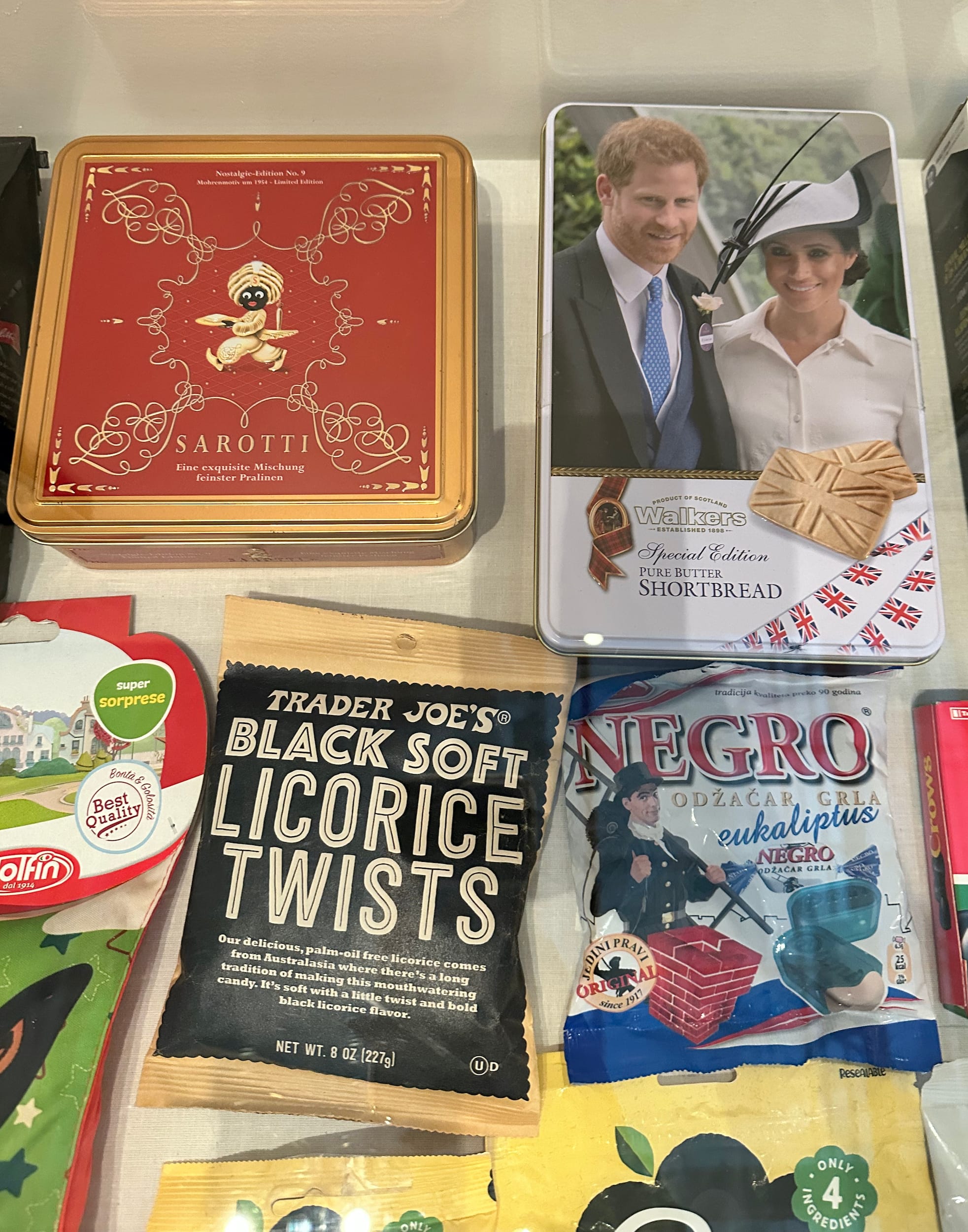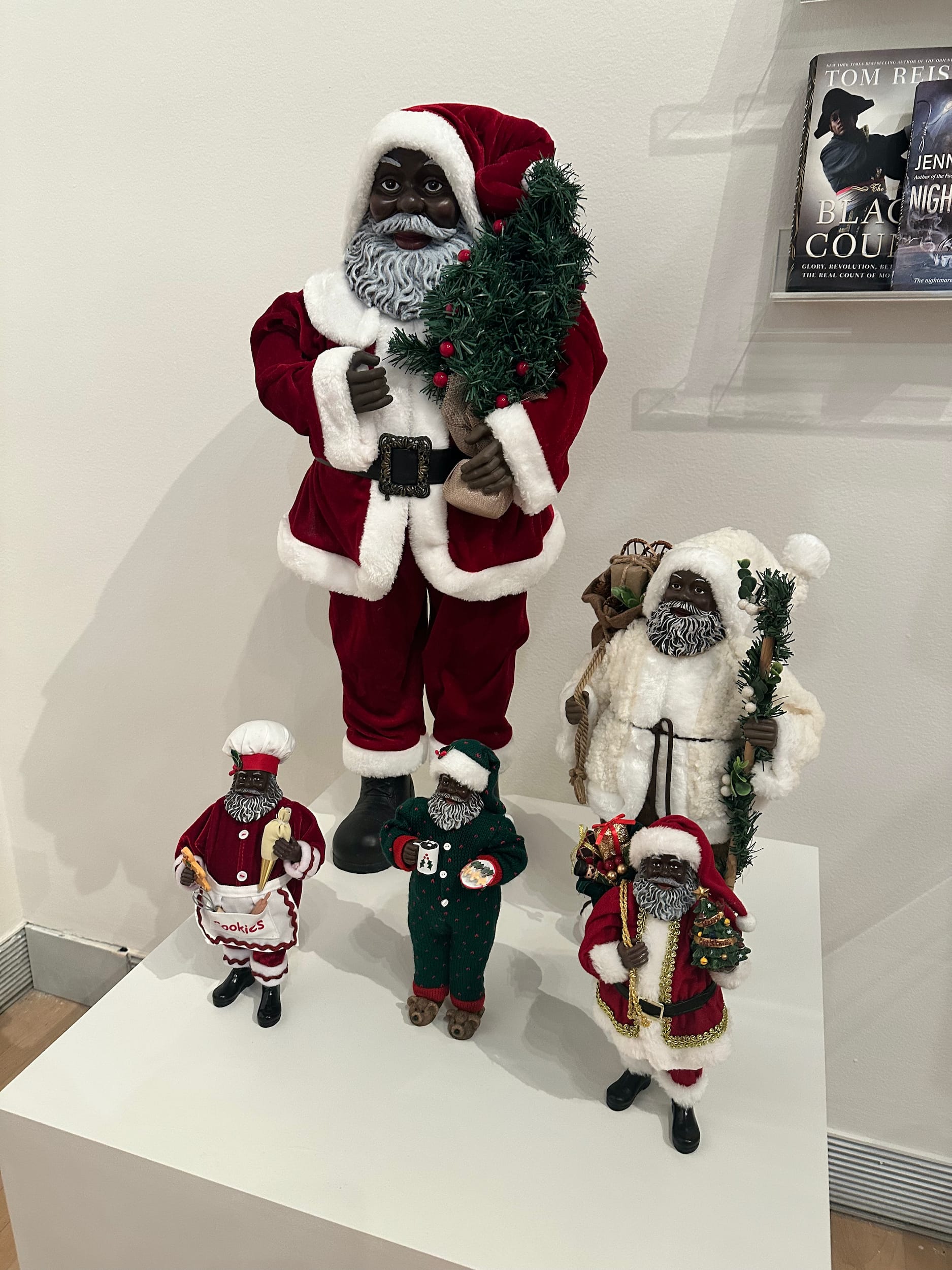 Wilson continues his critique of Western art institutions and museum classification with “North Africa, Europe, the Near East, and the Americas” (2003). This quadriptych depicts deep black figures with white sclera and teeth, who gaze at each other, as if to acknowledge a shared pain. The exhibition’s centerpiece is Black Now!, an installation of 2,500 objects Wilson has collected since 2005 that demands an unflinching gaze. This section pairs items with positive connotations, such as Black Santas or a cookie box depicting Megan Markle and Prince Harry, with negative items like Obama masks, minstrel characters on pralines, and sexual performance tablets. When I visited, I noticed many White viewers lingering in the first section of the exhibition, which is largely nonfigurative and decorative, while breezing through Black Now!’s paraphernalia. In the latter, objects are arranged in altar-like arrangements (i.e., a grouping of candles, liquor, and figurines) and summon uncomfortable minstrel associations. It made me wonder whether the section was intended as celebration or caricature.