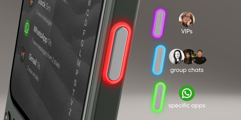 The Clicks Communicator has a smaller device and a form factor like a classic BlackBerry. The whole phone is shorter than a typical device, but with a physical keyboard taking up the bottom of the device. The hardware is very much built around the messaging focus, with a “Signal Light” built into the “Prompt Key” on the side of the device which can light up in various colors to signify messages from specific apps, group chats, and more. There’s also a physical switch that can be used to mute everything whenever you want, or configured to other functions.