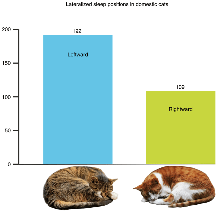A figure with the data.  They imply that individual cats always sleep on the same side, but I doubt that. And readers can check that themselves. It’s just that a random snapshot of cats on YouTube are mostly sleeping on their left side: