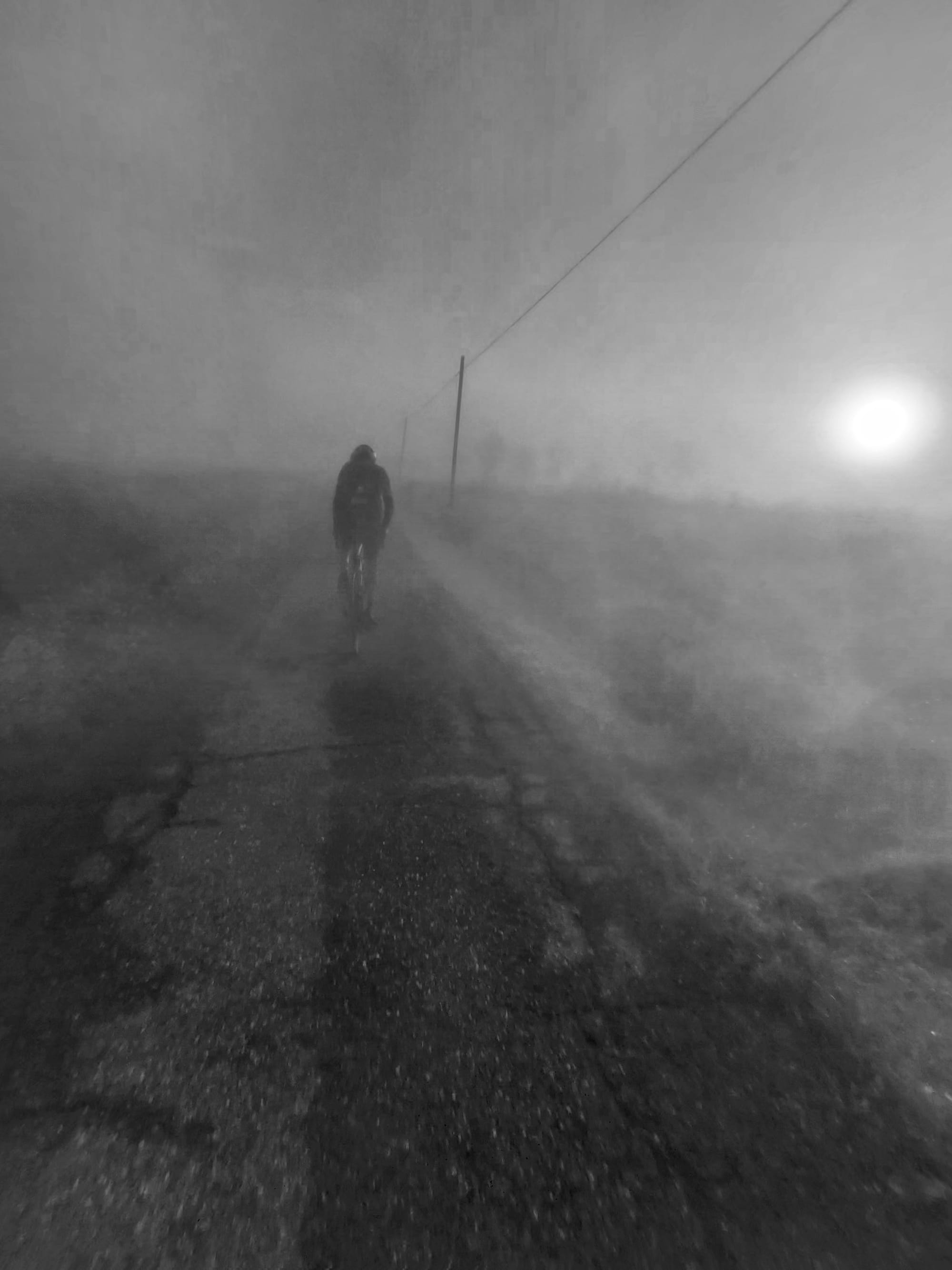 (Smartphone image) 7:30 in the morning. This is my friend Guido riding along the rice fields in the outskirts of Milano. It’s the start of autumn in October and the fog is quite thick. | Photo by Angelo Giangregorio