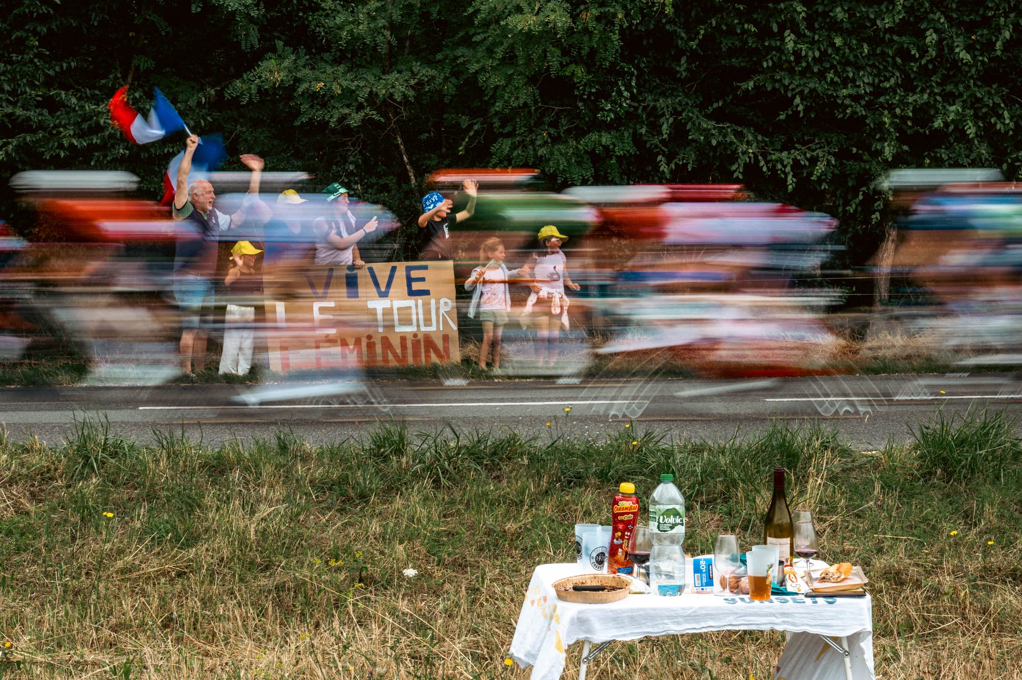 I love photography as a way of telling stories and awakening sensations. This image reflects what the Tour de France truly is beyond the race itself. The blur of the peloton expresses speed and movement, while the spectators remain still: grandparents bringing their grandchildren, sharing a tradition passed down through generations. A roadside picnic, flags waving, moments spent together waiting all day for the riders to pass. This is the spirit of cycling: a popular celebration that brings people together and turns a sporting event into a shared human experience. | Photo by Pauline Ballet (@paulineballet)
