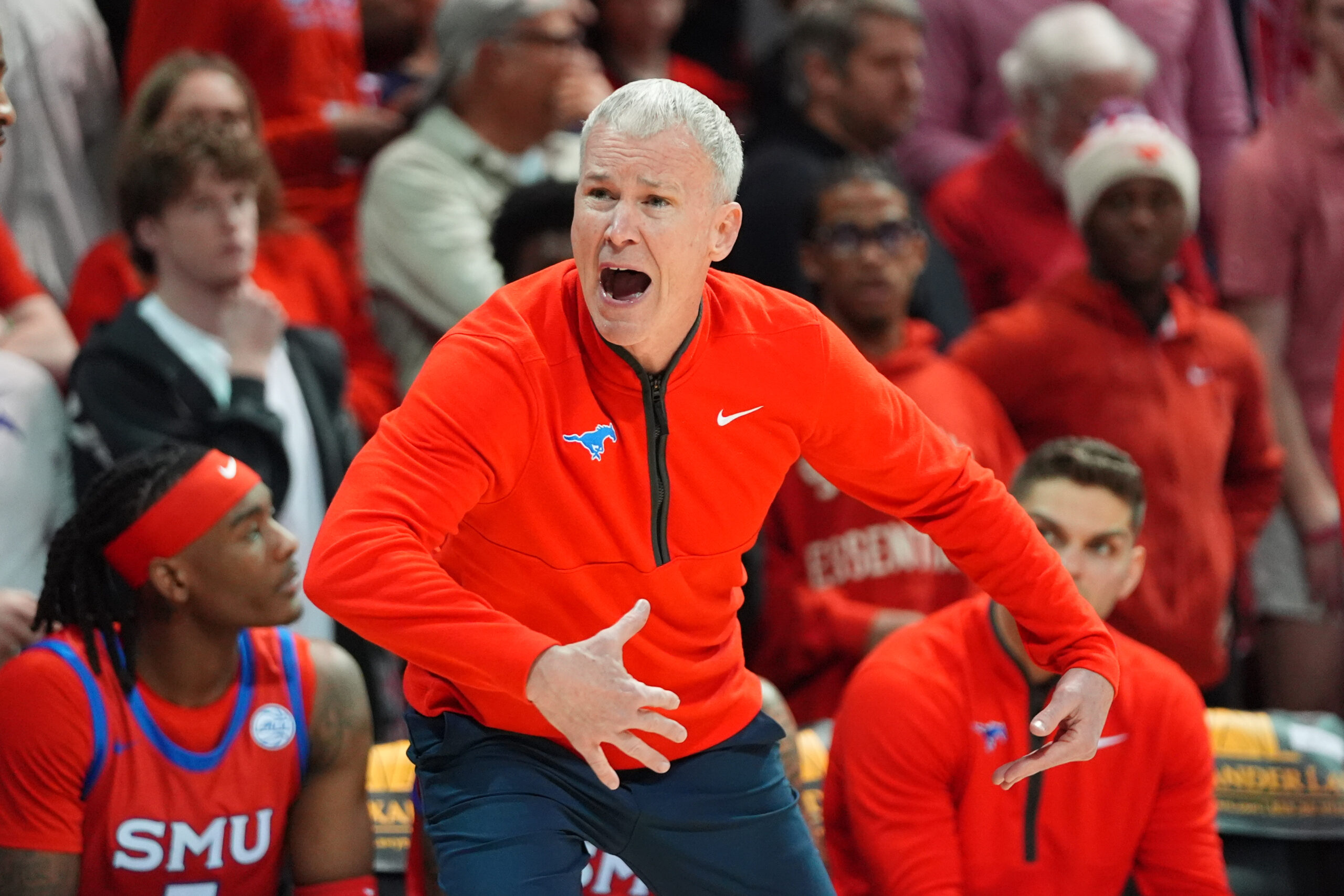 SMU head coach Andy Enfield yells during the second half of an NCAA college basketball game against North Carolina Saturday, Jan. 3, 2026, in Dallas. (Photo via AP Photo/LM Otero.)