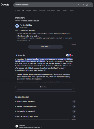 Screenshot from search for [what is a nepo baby], Google, December 2025Google’s Search Labs experiments, including features such as Preferred Sources, show how layouts and summaries change based on context, trust signals, and behavioral patterns.