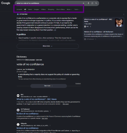 SERP features can also vary across markets and profiles. People Also Ask (PAA) questions and filters may differ by region, language, or click behavior, and may not appear at all. For example, the query “vote of no confidence” displays different filters and different top results in Spain and the UK, and PAA does not appear in the UK version.