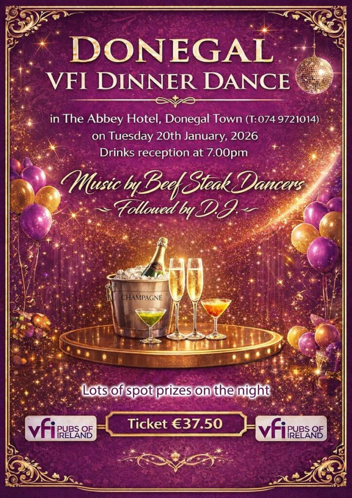 The annual Donegal Vintner’s Federation of Ireland dinner dance takes place in the Abbey Hotel in Donegal Town on January 20th next.