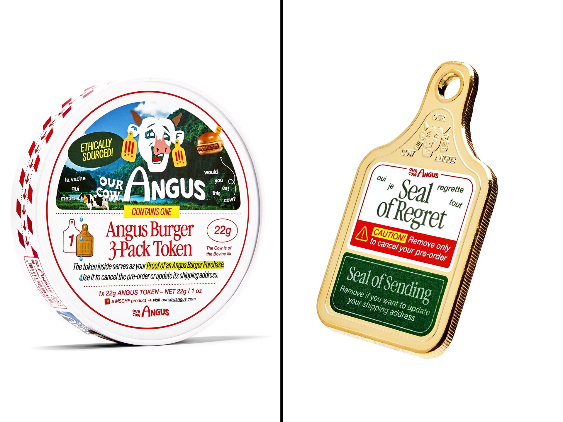 A burger token (right) and burger token packaging (left) for MSCHF’s project Our Cow Angus (2024-26) Courtesy MSCHF