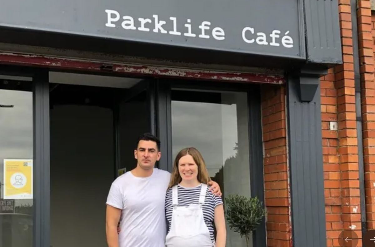 Shaun pictured outside his beloved Parklife Cafe in Crumlin with one of his customers, Naomi Moriarty.(Image: GoFundMe)